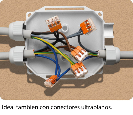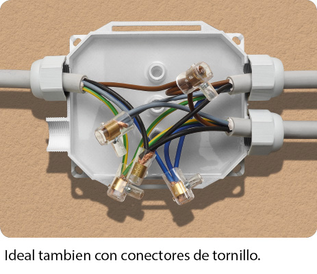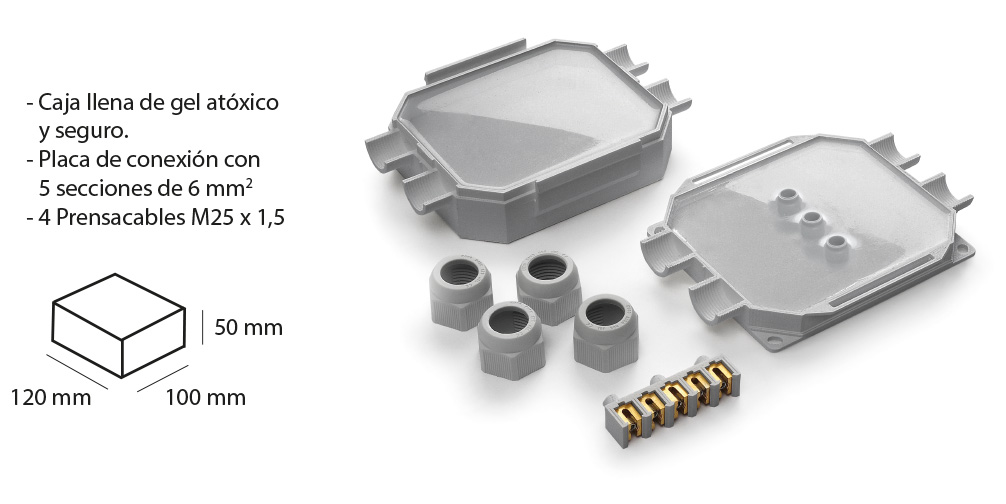 Caja de conexiones pre-rellenada de gel aislante con 4 entradas prensacables y placa de conectores de conexión para cables pentapolares de hasta diámetro 16mm.